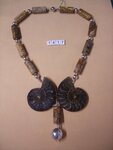 dit gouden collier bestaat uit een collier van gouden balletjes en malachiet kraaltjes, waaraan een malachiet plaat hangt waarop in een gouden zetting een smaragd met een brljantje is gezet.